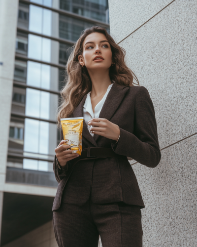 a woman from the side going to the office in a rush in the streets wearing a professional outfit and holding an energy bar in hands from the side - cinematic photography - cinematic style - realistic style --ar 4:5