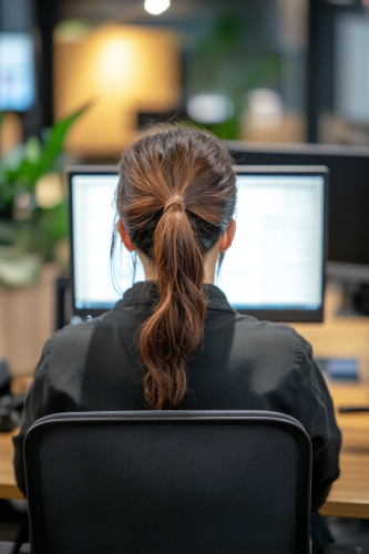 A Chinese female teacher is doing at the desk, facing the back of the monitor office, shooting at the oblique rear, the camera focuses on the monitor screen, the professional atmosphere, SONY α9 III --ar 2:3 --style raw --v 6.1