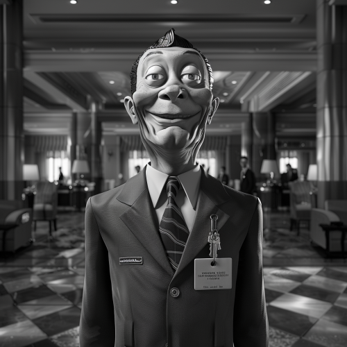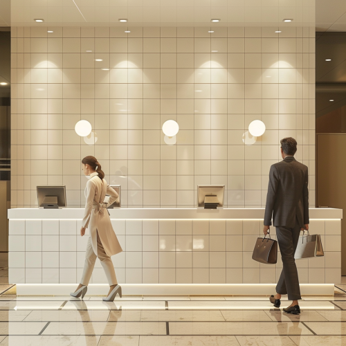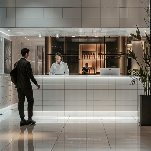 businesswoman walking up to a white tiled concierge counter with a male staff wearing a suit, angled view