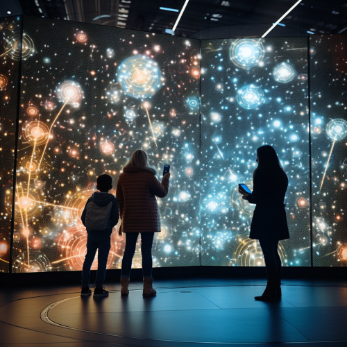 points of light on an interactive screen in the middle of a shopping center people touch the points of light
