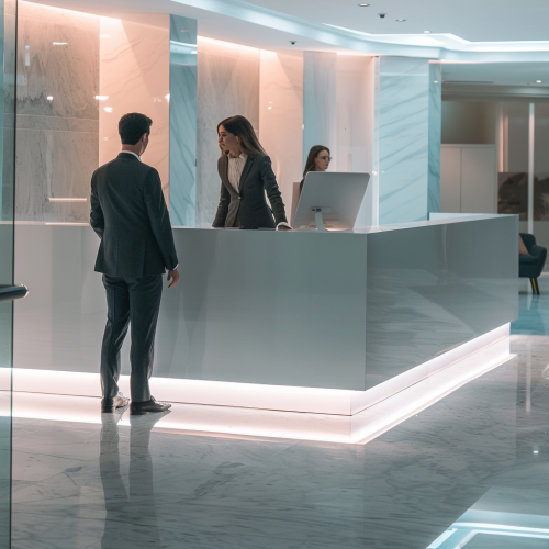 businesswoman walking up to a white tiled concierge counter with a male staff wearing a suit, angled view