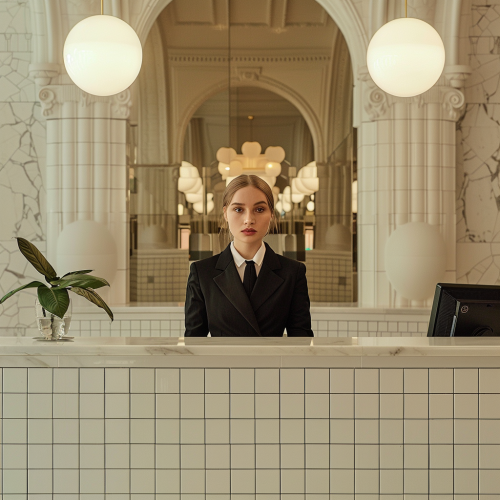 a female staff wearing black uniform behind white tiled concierge counter, frontal vie