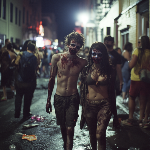 A photograp of a couple completely drunk walking almost zombie-like in the street after a long night of partying. They are wearing Halloween costumes. In the street there is people walking and celebrating Halloween. --style raw