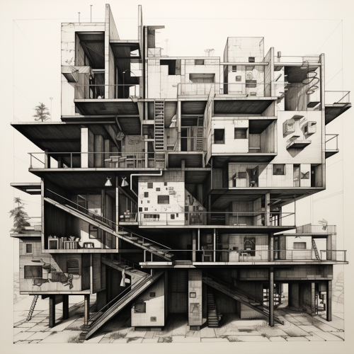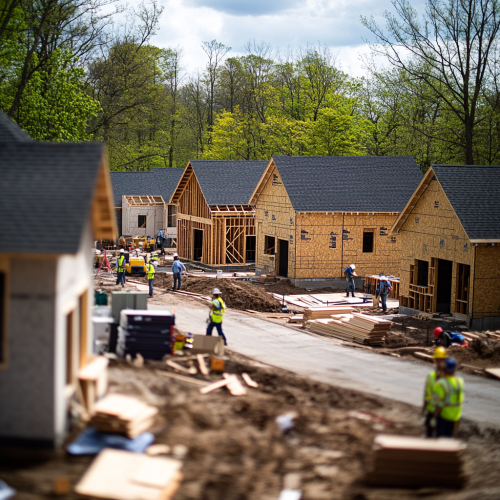 An image showing a small cul-de-sac or close-knit community with 4-6 houses in different stages of construction. Workers are seen laying foundations, framing walls, and installing roofs. The focus is on a collaborative atmosphere, with people of various ages discussing plans, supervising the build, or lending a hand, capturing a sense of community and shared effort, hot pink understones.--ar 16:9