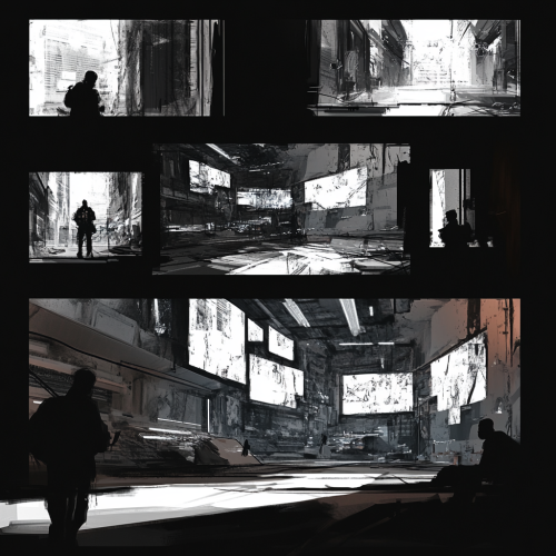 A storyboard sketch with 7 panels of the following story board prompt for a 1min30 promotional video presenting the DISRUPT collective: ###Scene 1: Introduction (0:00 - 0:10)