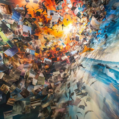 mural of collective images and photos blowing away into 3d space , 3d, cinematic --v 6.0
