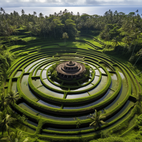 an architectural photography 3 storey retail building with modern bali architecture, balcony on top floor, focus on terrace walkway, modern bali inspired landscape, food stall in middle way, with a lot of visitors, fountain in middle hd photorealistic --ar 16:9 --v 6.1