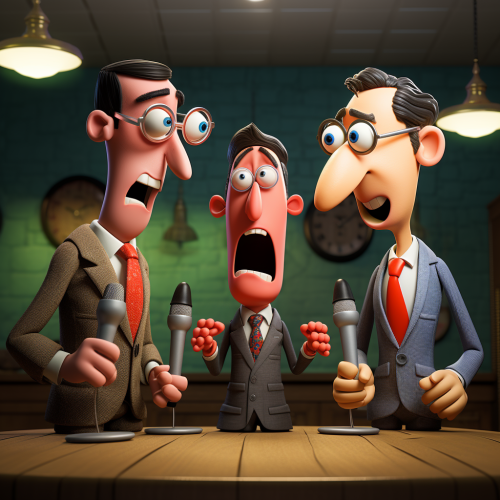 3d characters in the style of Aardman Animation. Two characters in suits are trying to convince another character (an animator), who is has his mouth closed and is not listening