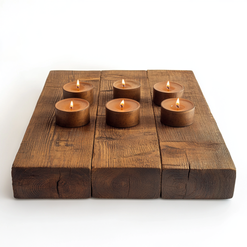 Butcher Block Style Board: A thick, sturdy wooden board that can hold multiple candles and accessories, creating a stable and substantial display, antique look, on white background