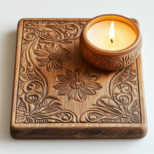 Oval Wooden Board: An oval-shaped board that offers a softer shape, great for creating an elegant candle arrangement, antique look, on white background