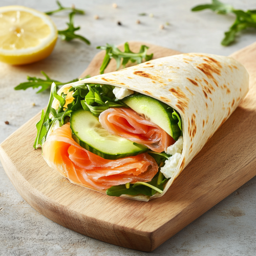 A high-definition image of a neatly wrapped chicken and avocado tortilla wrap, sliced in half to reveal layers of grilled chicken, creamy avocado, fresh tomatoes, and crisp lettuce. The wrap is served on a rustic wooden board, with fresh herbs and a drizzle of lemon juice glistening on top. The textures of the ingredients are highlighted, with the wrap appearing soft and perfectly rolled. Captured in 8K resolution, the vibrant colors and fresh ingredients create an inviting and appetizing visual.