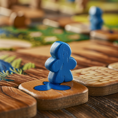 a blue, wooden Meeple placed on board game tiles for a cartoony, medieval themed board made up of tiles. Each tile represents a resource like grass, wheat, water. Photorealistic, high depth of field. --v 6.0 --style raw
