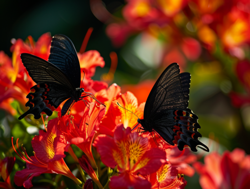 the butterflies sit on bright red and orange flowers, in the style of zeiss otus 85mm f/1.4 apo planar t*, light black and dark azure, shallow depth of field, enigmatic tropics, dark black and turquoise, vibrant, lively, iridescence/opalescence --ar 4:3 --v 6.0 --style raw