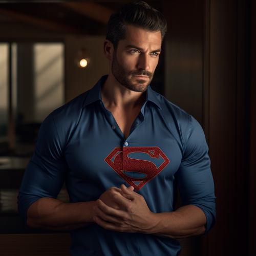 An ultra-realistic photograph captured with a Sony α7 III camera, equipped with an 85mm lens at F 1.2 aperture setting, man in his 40s wearing a shirt with some superman cufflinks on the shirt cuffs, shot in high resolution and a 16:9 aspect ratio, –ar 16:9 –v 5.2 –style raw