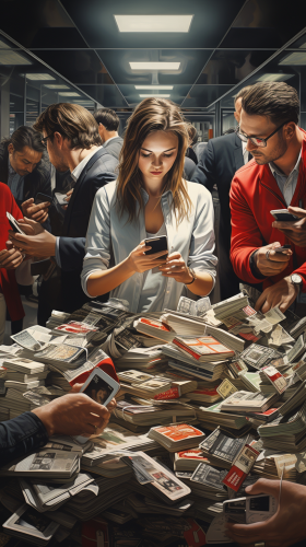 consumer society. expensive cars, phones, mass purchase of goods, hyper realistic, rwa style --ar 9:16