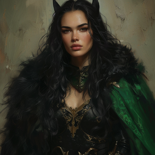 portrait female warrior, black long wavy hair, wide horses ears, tanned skin, green mantle armour, black fur, long green cape, oil painting, Frank Frazetta artwork style, HD, 8K, dramatic lighting, clear details, character design, --v 6.0