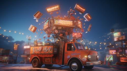 giant flying pizza delivery farmtruck, lots of lights, stylized, unreal engine 5, --ar 16:9