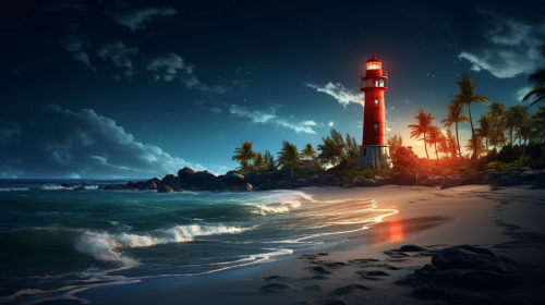Highly realistic photos, texture detail, film noise, black and white photos, night, beach lighthouse, lighthouse lights only saturated yellow --ar 16:9