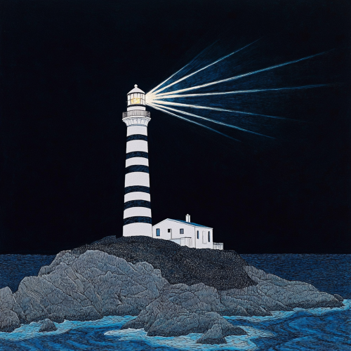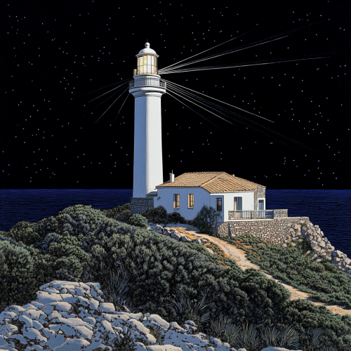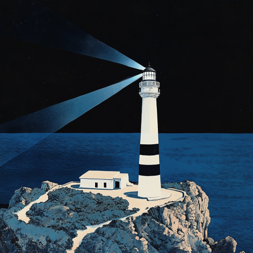 Visualize a beautiful drawing of the Cala Figuera Lighthouse, in Mallorca, which has a white shaft with diagonal black bands, the night is black, the figure of the lighthouse is large and stands out against the very dark blue-black background of the sky and the sea, the lighthouse is on and from above, 26 long beams of light come out from its flashlight, ultra high definition