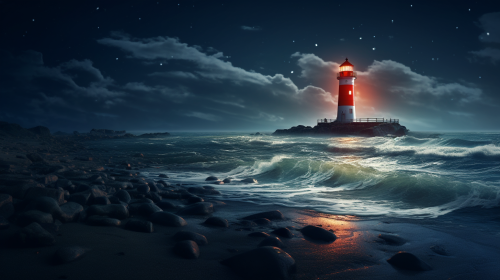 Ultra realistic photography, texture detail, film noise, black and white photography, all black and white night, lighthouse on the beach, close-up, lights coming straight from the lighthouse, cinematic lighting, cinematic composition, dynamic --ar 16:9