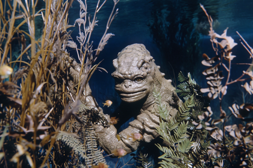 DVD screengrab of a scene from the stop-motion animated movie creature from the black lagoon, creature, in the style of rankin bass swimming underwater through water plants and sea weed, little fish swimming around, 1960 --ar 3:2 --v 6.0