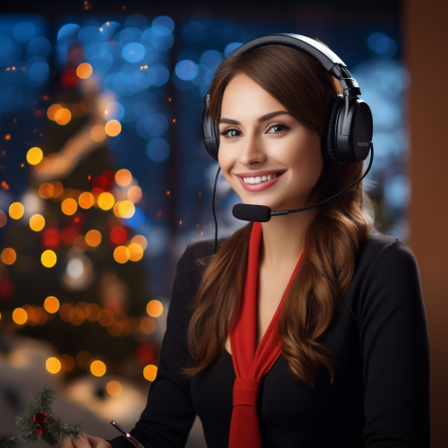 Photograph of a young woman, a call center worker with a headset, working on a laptop at an office desk, and a man in glasses using a computer. The person is facing back to the camera. This is a customer service concept.