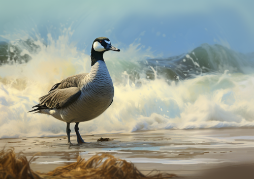 a brant goose standing on the beach, foamy waves crashing onto the sand, sea kelp, bluish green water, cinematic light, subtle diffusion, untrarealistic, hd, in the style of Jim Hautman, --ar 10:7