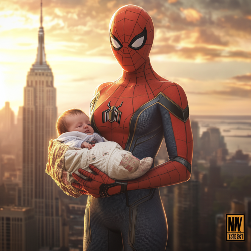 A female version of Spiderman with a strong maternal presence, standing tall with her signature suit redesigned to accommodate motherhood elements. Her suit should have soft curves and additional pockets for baby care gear, maintaining a blend of Spider-like features and motherly warmth. Imagine her cradling a baby, with spider-web details woven gently into the baby blanket. The background is a classic New York City rooftop at sunset, with the skyline and the iconic Empire State Building visible, the atmosphere filled with a soft, golden glow.cinematic,high quality.
