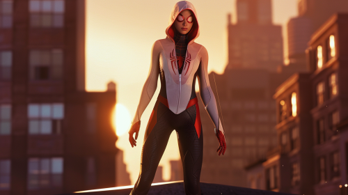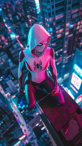 A photorealistic full-body Spider-Gwen, unmasked, perched on the edge of a New York rooftop at night. Her face shows focus and determination, with her blonde hair flowing slightly in the wind. Her iconic white, black, and pink suit stands out against the glowing city lights in the background. Cinematic lighting, photorealistic textures, hd quality --ar 9:16 --v 6.0 --s 50 --style raw
