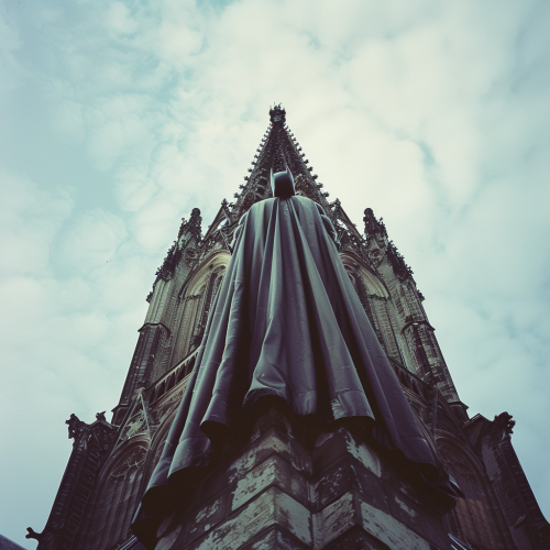 Clermont-Ferrand cathedral, Batman on top of the cathedral, low angle, kodak gold film effect, realistic photography