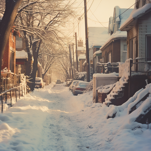 A Snow removal operation in acanadian suburb street in winter time featuring gray domp truck and Orange heavy machinery like wheel loader and grader full sized LEGO And a huge flag that says "DES BLEUS" --ar 16:9 --v 6.0