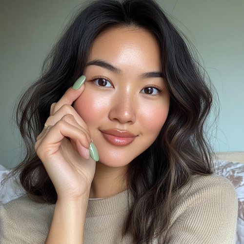 A photo of an asian woman face and shoulders taken in front, with no makeup on her slightly smiling mouth. The background is her bedroom. It's an iPhone selfie, taken at at desk. A closeup shot of a woman wearing beige with 5 fingers on each hand showing off her new nails that are painted with a shimmery sage green color with loose waves hairstyle
