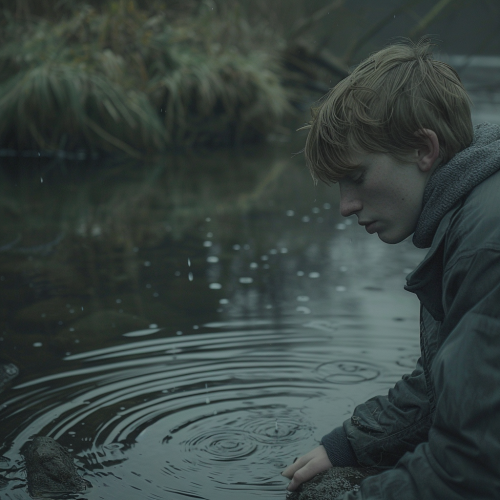 A close-up shot of a young man (Tomás) kneeling by the edge of a murky river, his face tense with growing unease. A subtle ripple breaks the still water, as though something large is moving just beneath the surface. The atmosphere is quiet and heavy, amplifying the sense of impending danger. --v 6.0