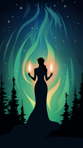 a silhouette of a goddess figure holding a candle in the dark, northern lights in the sky --s 750 --ar 9:16