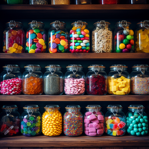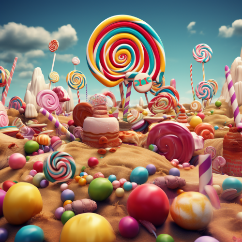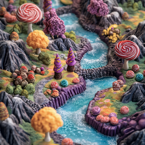 ariel view, dungeons and dragons scenic portrait, candy themed landscaping, trees made of lollipops, rivers flowing with chocolate, mountains made of rock candy, valleys spun with sugar grass.