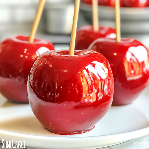 Close-up of shiny red candy apples on a white plate. Each apple is coated in a glossy, smooth candy shell with a deep red hue, reflecting light beautifully. Wooden sticks are inserted into the apples, giving them a classic look. The background features a softly blurred kitchen countertop, adding warmth to the scene. Text overlay includes the title 'Shiny Candy Apple Recipe' and a list of ingredients such as apples, granulated sugar, and light corn syrup