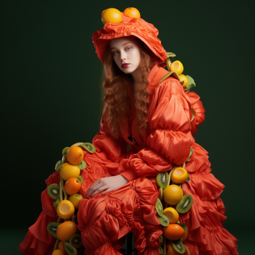 female model, clothes made of fruit, modeling shoot, product photo, realistic, high resolution