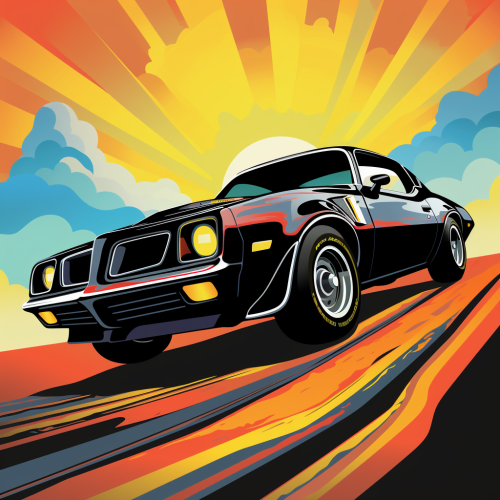 Black 1977 Pontiac Trans Am Firebird, in retro abstract style, simple cartoon, dynamic angles, inspired by vintage Monaco racing posters, blue sky and tropical background