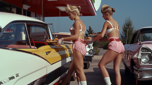 drive-in restaurant 1960s, 2 car hop full figure waitresses in shorts bending down and putting food tray in car window, color, shinny cars --ar 16:9 --v 6.0 --s 50 --style raw