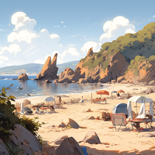 a coastal road littered with rocks, sandy beach with people sunbathing, 8k --s 250 --niji 5