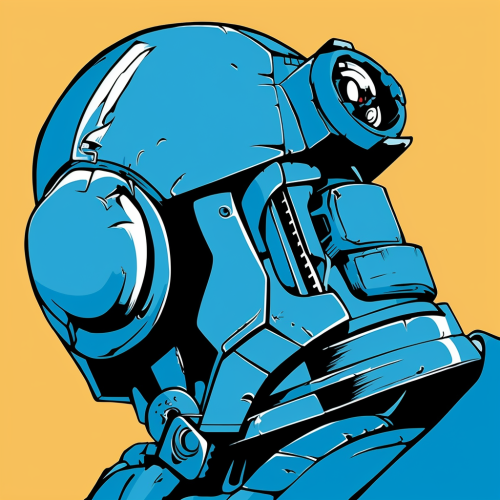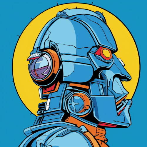 Blue sleek robot art by Ed Roth and Basil Wolverton, nft profile picture, character posing, side view of head, half body, flat vector art, flat illustration, minimalist, vibrant colors, colored background, rule of thirds, centered, good composition:: text, watermarks::-0.5 --v 5.0