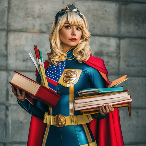 Lady Victory in a back-to-school themed costume. Her iconic superhero suit is modified with school-themed accessories, including a patriotic and a school crest emblem. She wears a cape that resembles a school blazer and has a pencil-themed belt. She holds a stack of books and a ruler as props. The costume is dynamic, colorful, and blends superhero and school elements. The overall style is vibrant and detailed.