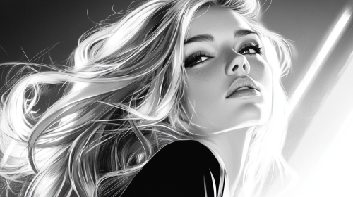 storyboard illustration of a beautiful blonde woman with refracted light in the foreground, concept art, storyboard, black and white, pencil drawing, --ar 16:9 --v 6.1
