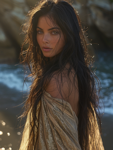 stunning young woman with long, flowing black hair stands near the edge of a cliff at sunset. The golden light from the setting sun casts a warm glow over her skin and hair, creating a radiant and ethereal effect. Her gaze is soft yet captivating, as she looks over her shoulder towards the viewer. The backdrop features dramatic cliffs and a rugged coastline, with waves crashing below. She is wrapped in a golden, shimmering fabric that drapes elegantly over her shoulder, enhancing her natural beauty and blending harmoniously with the sunset hues. --style raw --stylize 999 --v 6.0 --ar 3:4