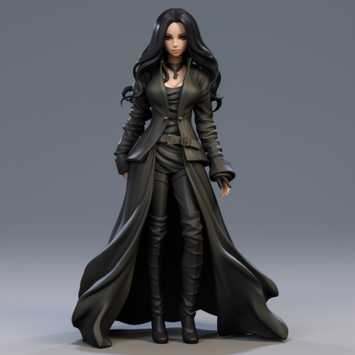 fullbody picture of anime inspired clay figure, 3D character design: a woman with long black hair, black coat outfit. --v 5.2