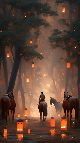 Craft an imaginative book cover that portrays the essence of equine-assisted learning and AI integration. Show a visionary scene of a leader guiding a group of people through a virtual forest, illuminated by the soft glow of AI-generated lanterns. The atmosphere is one of wonder and discovery. Create this cover as a digital painting, using vibrant colors and dreamlike textures, --ar 9:16 --v niji