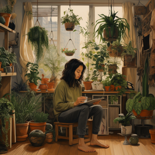 A Korean woman in her 30s sits comfortably in a room full of plants and interacts with them