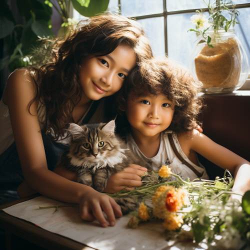 Photo in the light botanical room, two Asian lesbian couple and a Amerasian child with blue eyes and golden curly hair they hug with each others, a cat lying on the table, shot on kodak Ektachrom 100 plus, the sun shining, movie shot, film texture, Medium Long Shot, realistic photography, surreal, high detail, 4K--ar 3:4 --s 750