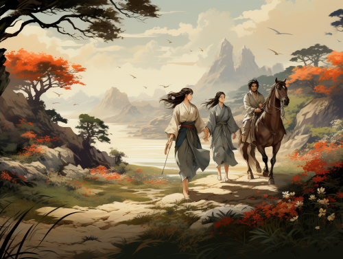 [d286dc535] A young handsome Chinese man with black hair, dressed in simple attire, leading a horse with two middle-aged women on its back, walking towards the grassland. The artwork is in a Chinese ancient style, with panoramic view, detailed facial features, 8K resolution, comic style, highest quality, best details, and utmost clarity. --v 5.2 --s 1000 --ar 4:3 --c 0