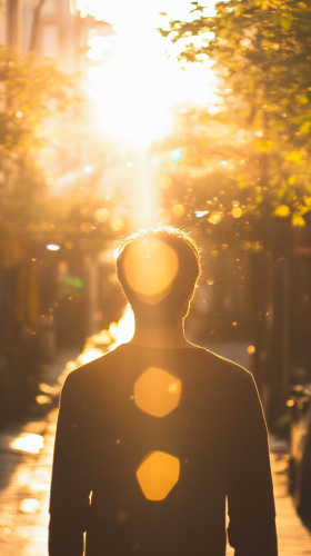 The back of a man walking down the street in the dazzling light of the sun. A viewpoint looking at the back of the man from a distance. The scene is beautiful, yet somehow sad, with a meaningful atmosphere. The sunlight has a yellowish hue reminiscent of late afternoon. A photographic representation of reality. --no illustration, painting, --style raw --ar 9:16 --v 6.1